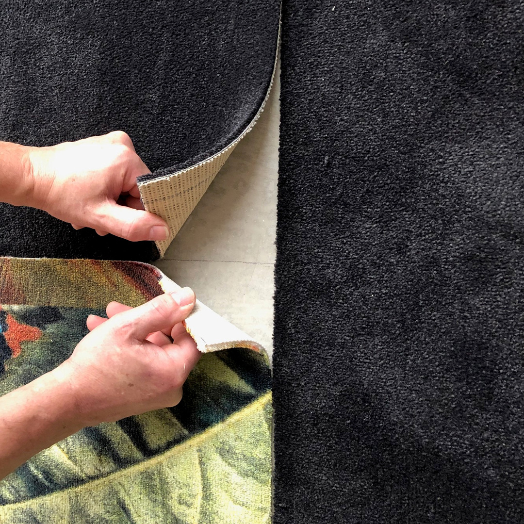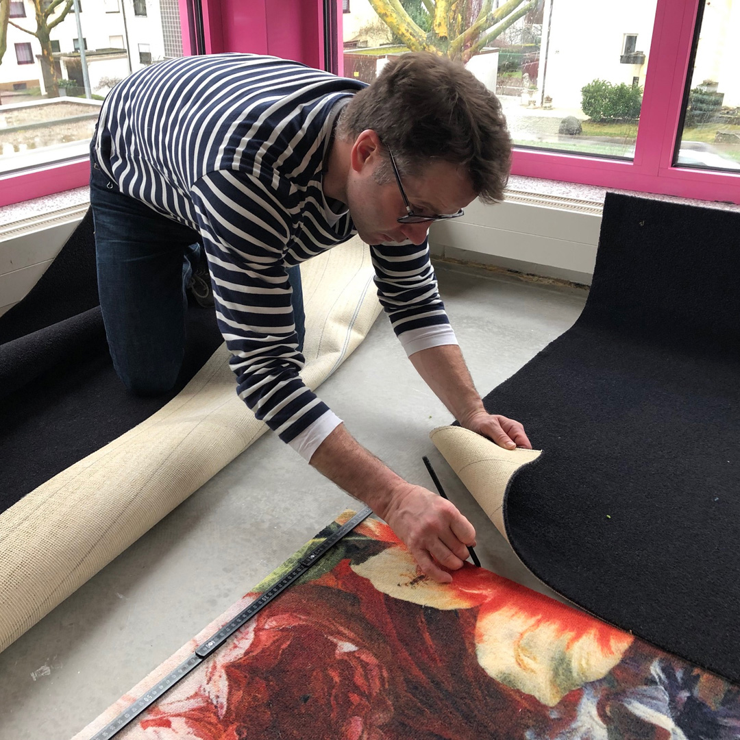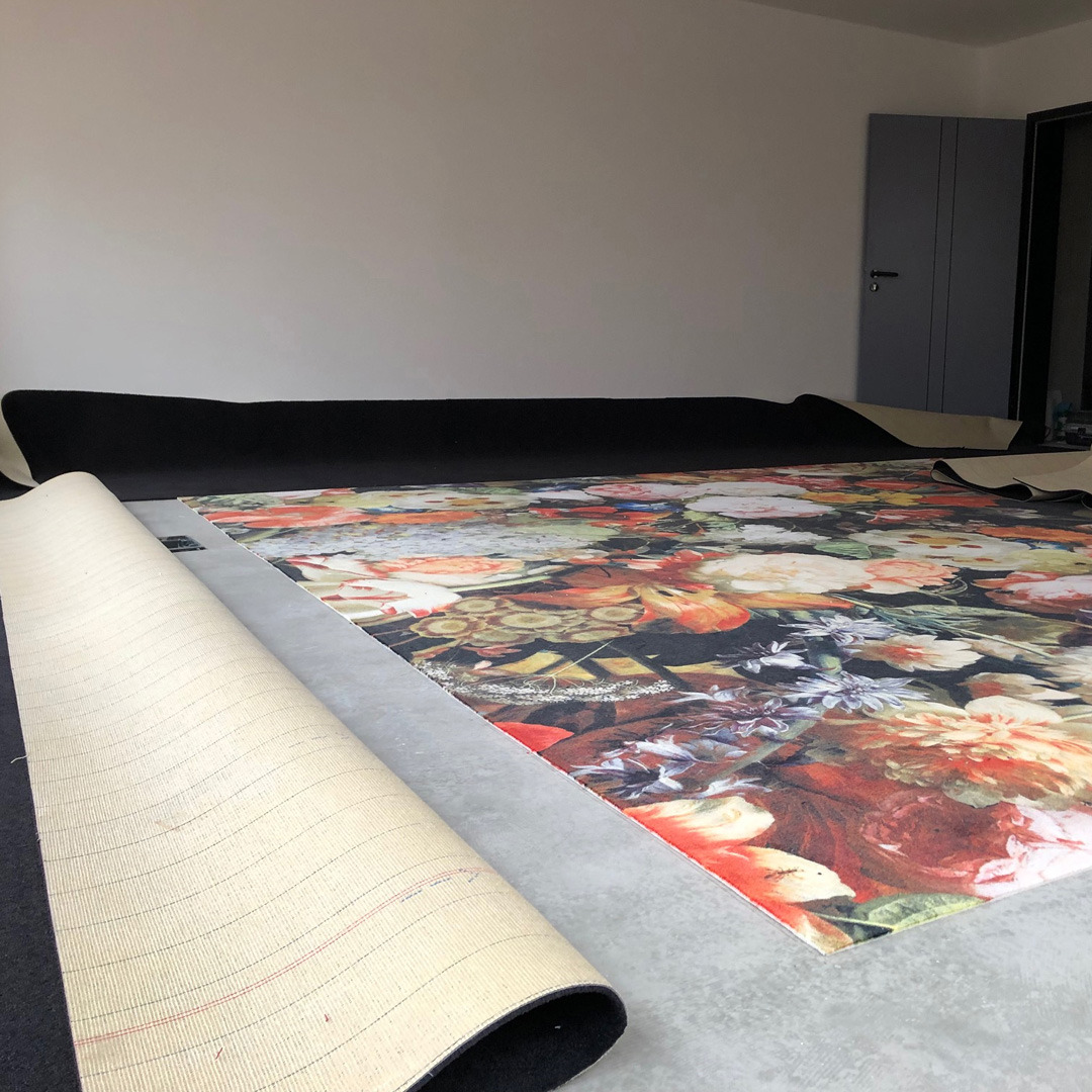 Beratung, Lieferung, Verlegung. Teppichboden-Verlegung mit Intarsien. Florales Panneau mit unifarbenem Fries.
