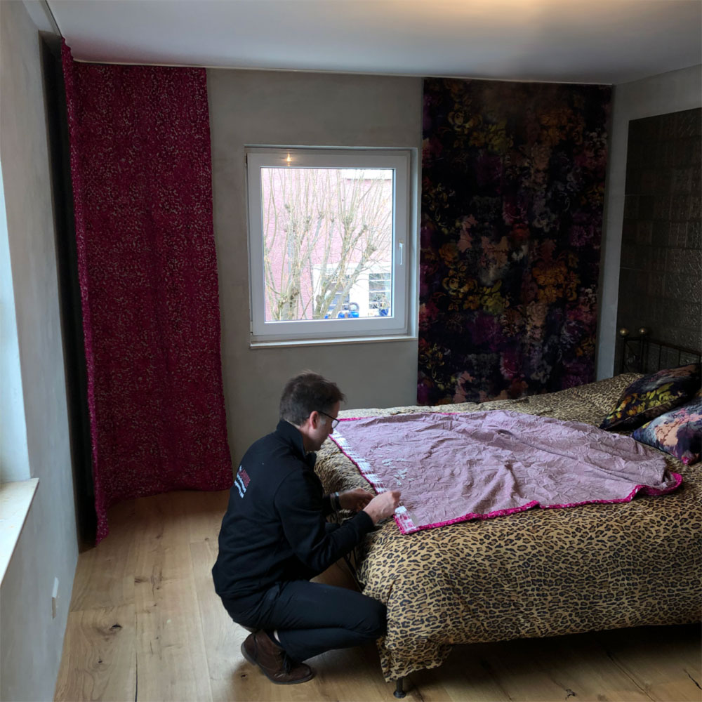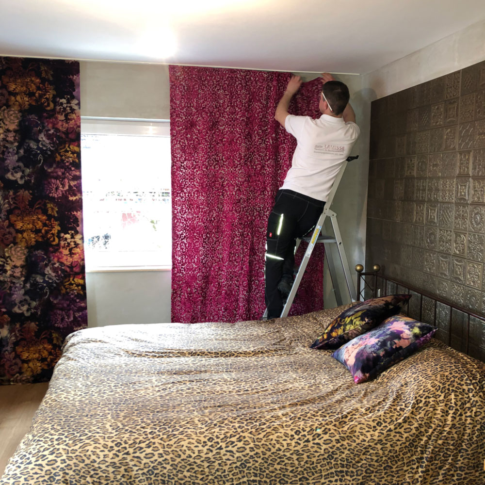 Familie Fischer kam mit ausgesuchten Stoffideen vom Hersteller Designers Guild in unseren Showroom in Stuttgart. Ganz offen und unkompliziert haben wir die Situation vor Ort diskutiert und uns gemeinsam dazu entschlossen einen zusätzlichen Uni-Stoff zu kombinieren. Mit den nun ausgewählten Stoffen ging es zum Vor-Ort-Termin, um ein genaues Aufmaß zu erstellen. Nach der Anfertigung in unserem Atelier ging es dann zur Montage. Nach der Fertigstellung waren alle mit der Stoffauswahl und dem neu dekorierten Schlafzimmer hellauf zufrieden.