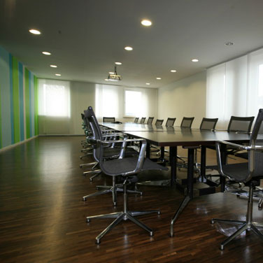 Zu Bild 1: Sicht- und Blendschutz für Konferenzräume durch Schiebevorhänge, um die Nutzung von Beamer-Präsentationen zu ermöglichen.