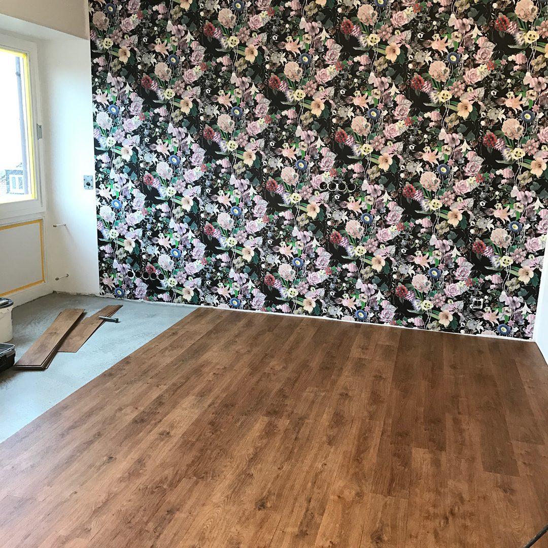 Einrichtungskonzept in vielen frischen Farben. Sofa von Sophisticated Living, Leuchten von Aqua Creations, Sideboard von Cube, Tapete von Designers Guild, Teppich von Kinnasand, Vinylbodenbelag in Holzoptik.