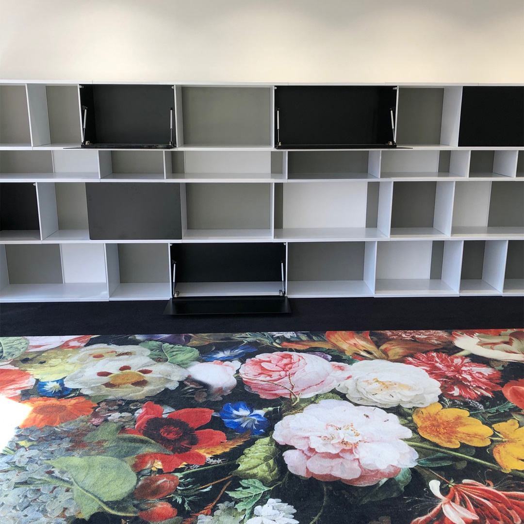 Einrichtungskonzept für Büroräume. Schreibtisch von Renz, Vitra Stühle, Teppich von Moooi Carpets und Object Carpet, Sofa "Bart Daybed" von Moooi, Beleuchtung "Mito" by Occio, "Wink asy" LED, maßangefertigte Schreinermöbel, Sideboard "Source" by Extendo.