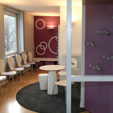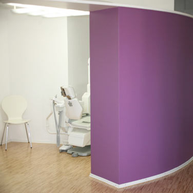 Durch eine lilafarbene Wand im Eingangsbereich wird der Patient empfangen und zum Mittelpunkt der Zahnarztpraxis geführt. Im Wartezimmer trifft man auf lila gestrichene Wände. Verschiedene organische Formen bilden sich an der Wand, den Stühlen und den Tischen ab. Durch weitere lila Farbakzente werden die Patienten durch die Praxis geleitet und dezent in die einzelnen Behandlungszimmer geführt.