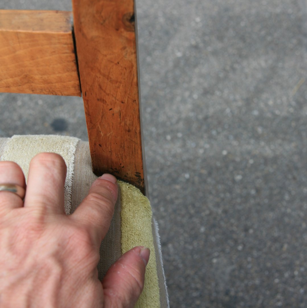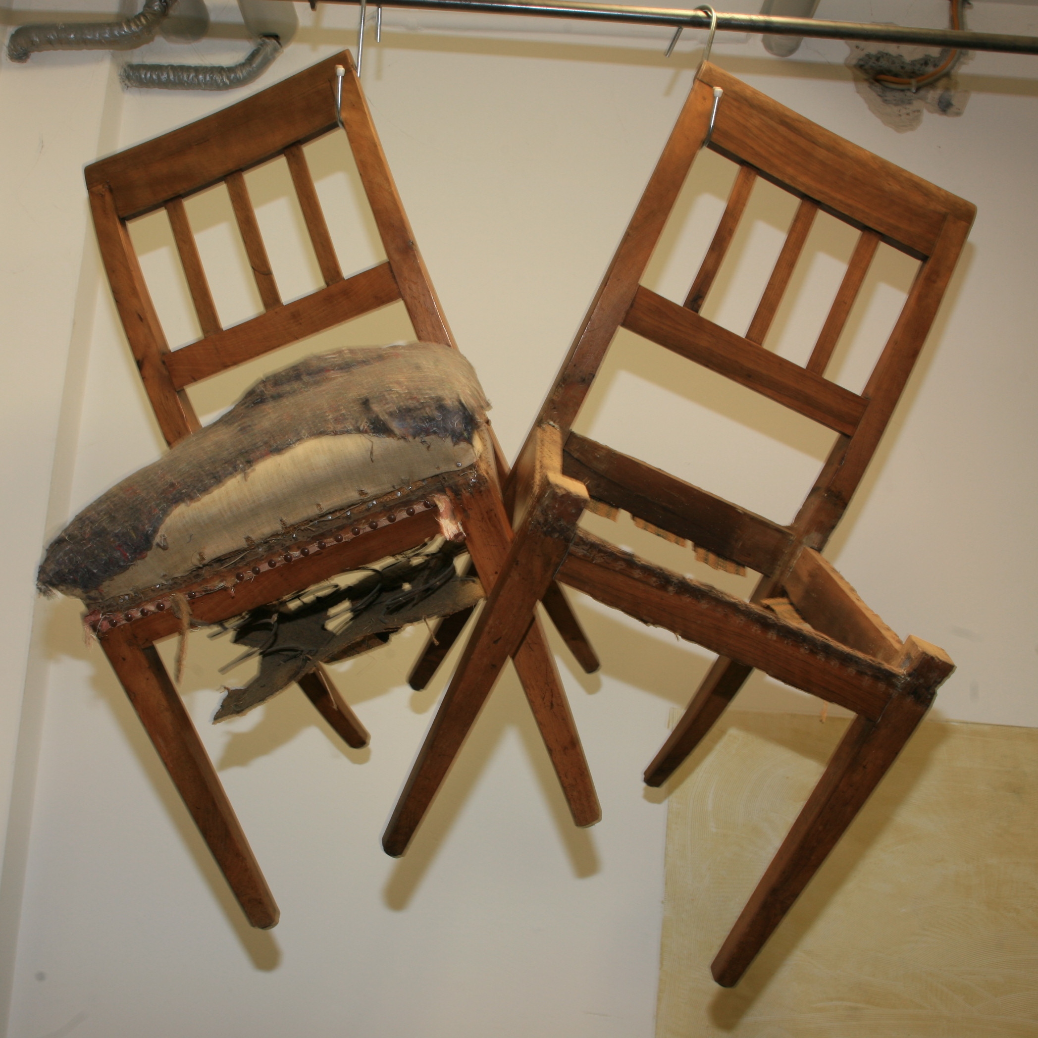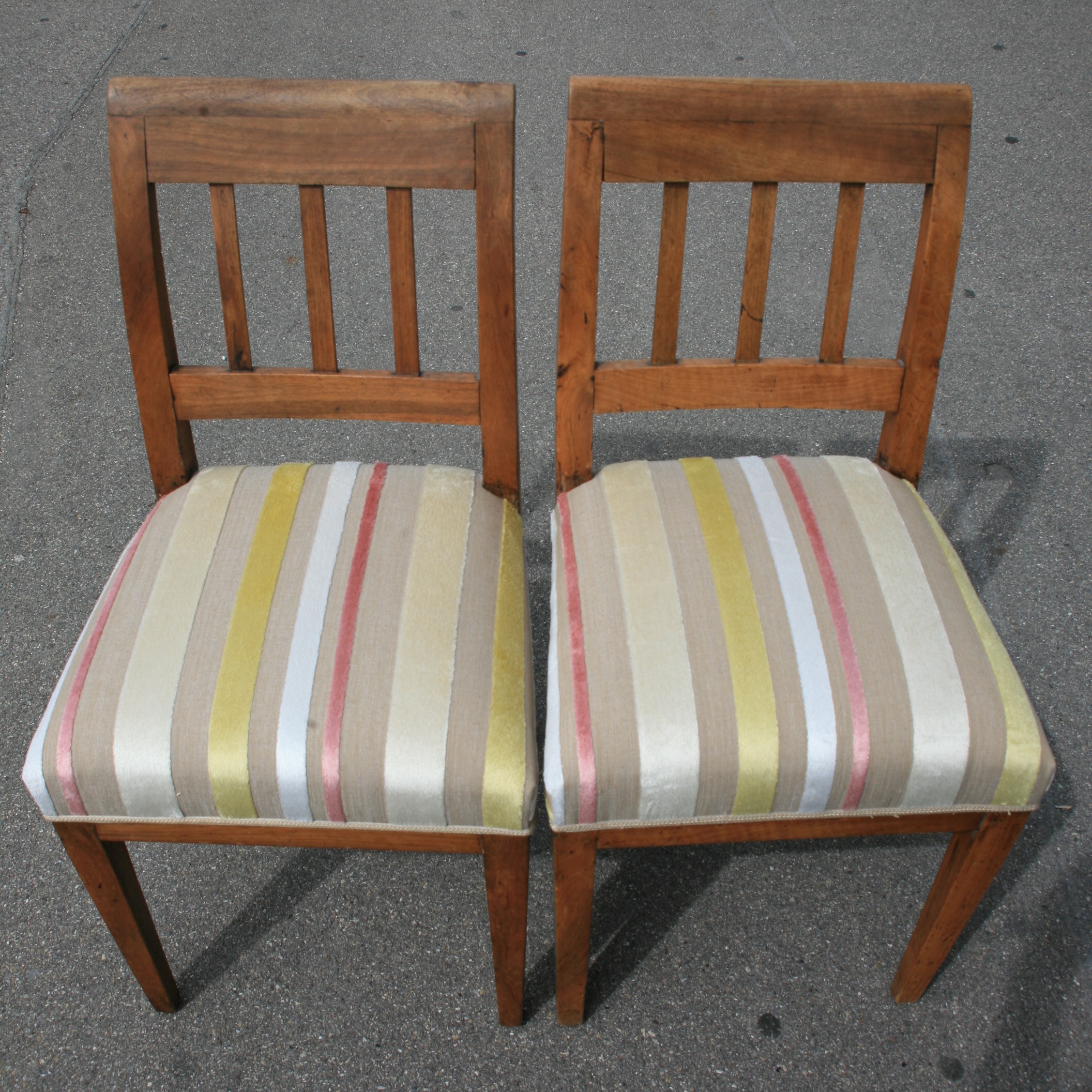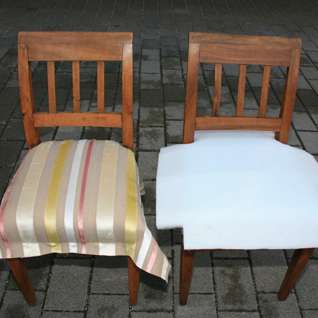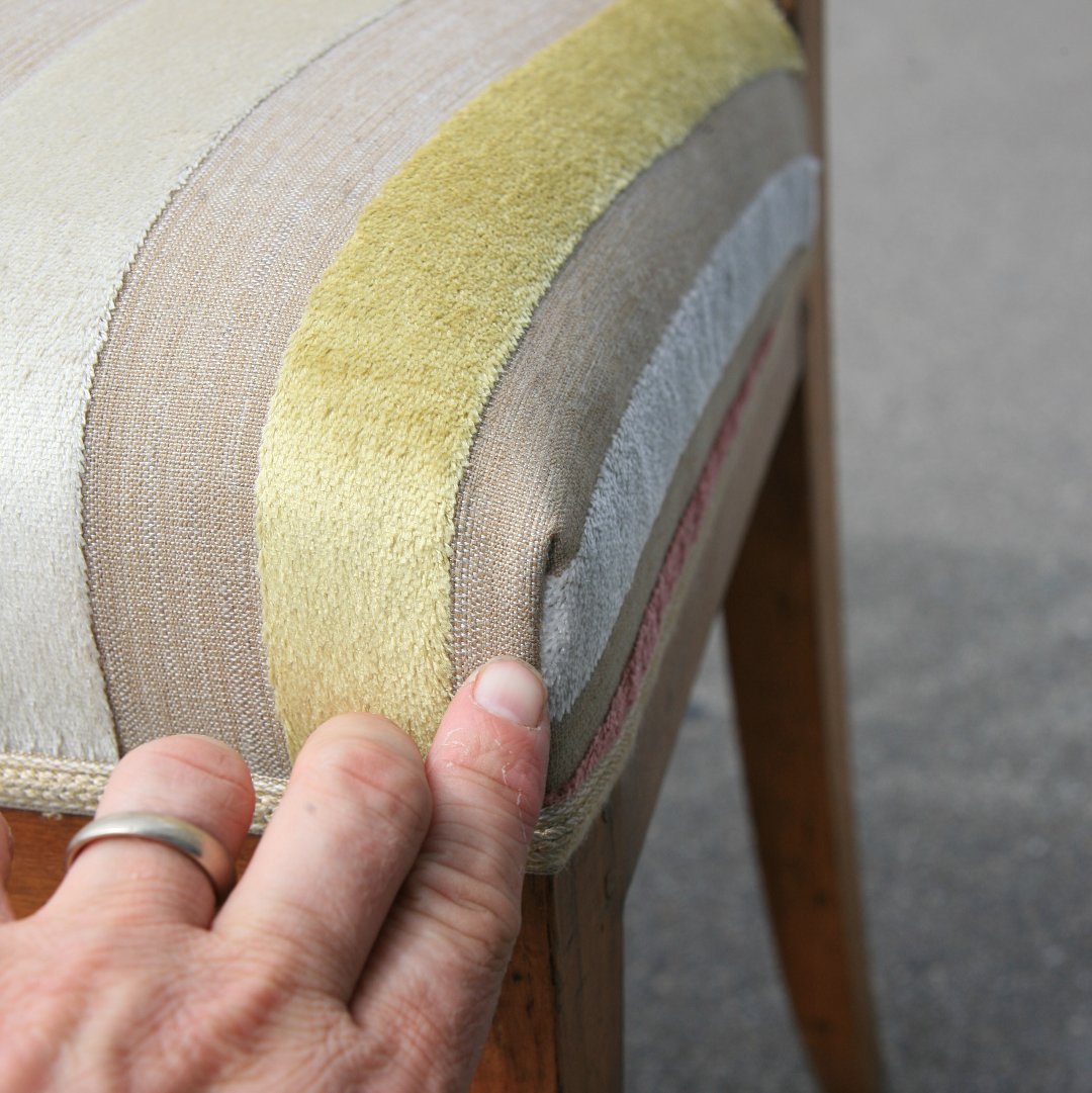 Polsterei & Bezugsstoffe: Polsterstühle, antik Aufpolstern und Beziehen von Stühlen mit abschließender Bordüre. Auftraggeber: privat. Aufpolstern und Beziehen von zwei Stühlen, Polsterbezugsstoff von Designers Guild, mehrfarbig gestreift.