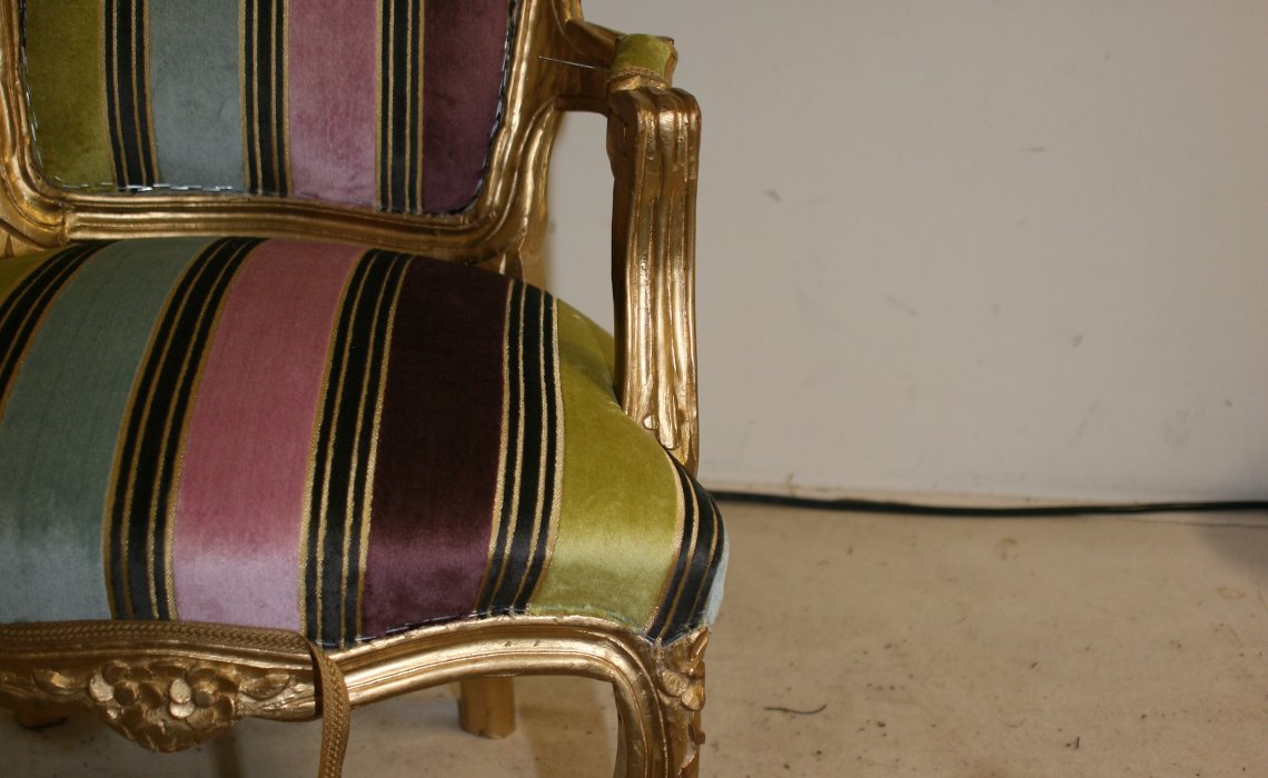 Kindersessel, golden lackiert, klassisch aufgearbeitet und mit mehrfarbig gestreiften Niederflorvelours (Samt) von Designers Guild bezogen. Finaler Abschluß mit passender goldfarbenen Borte.